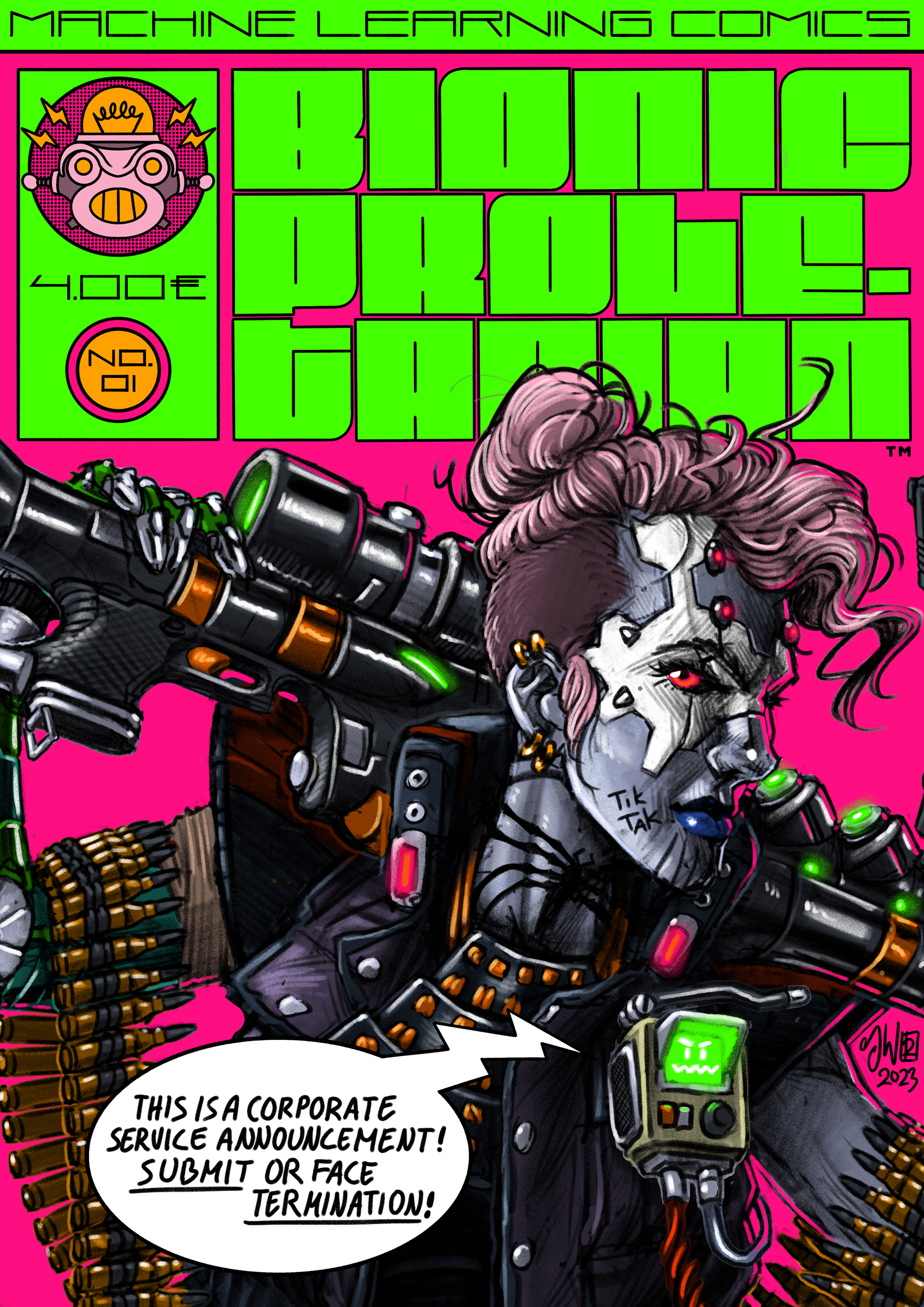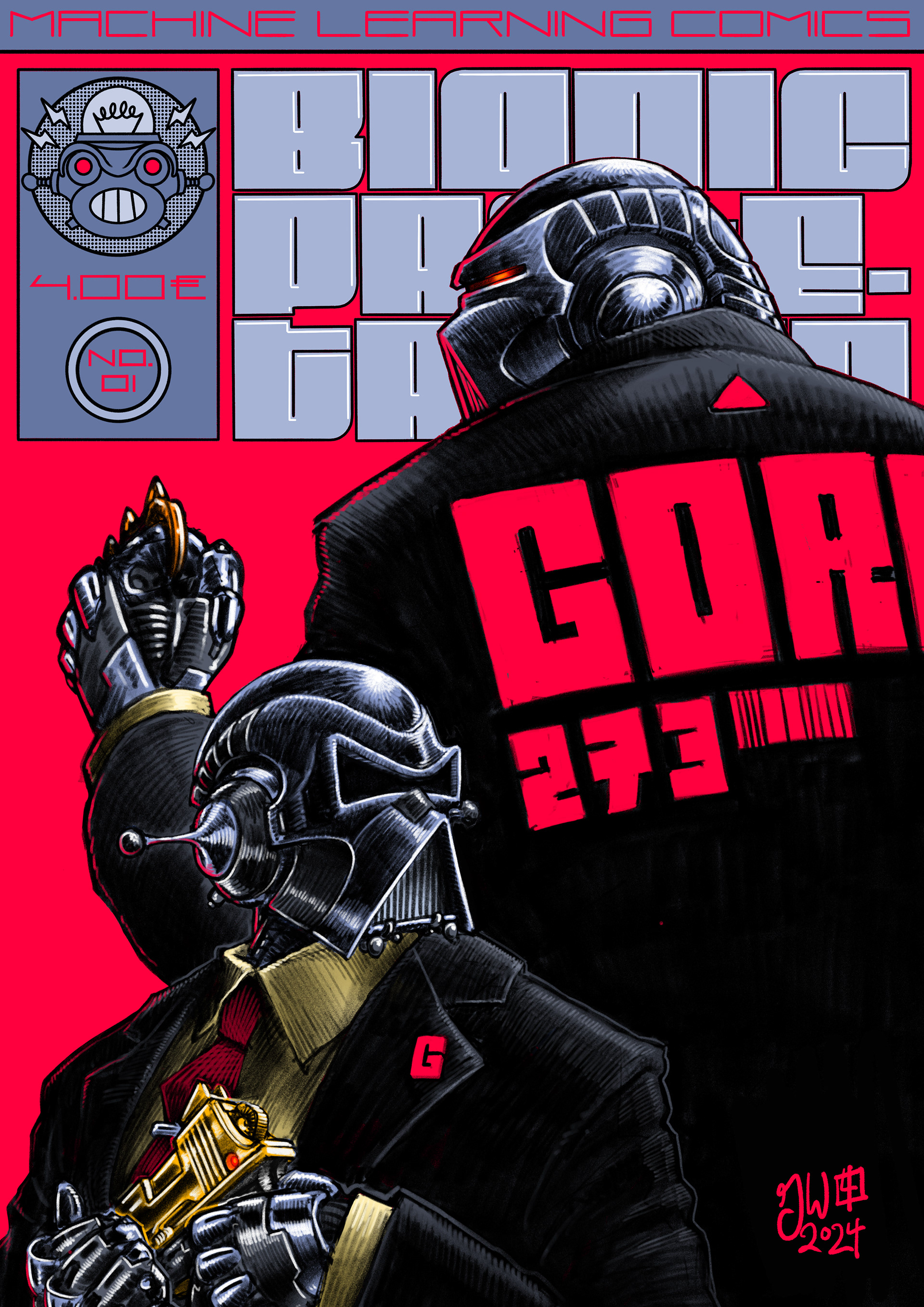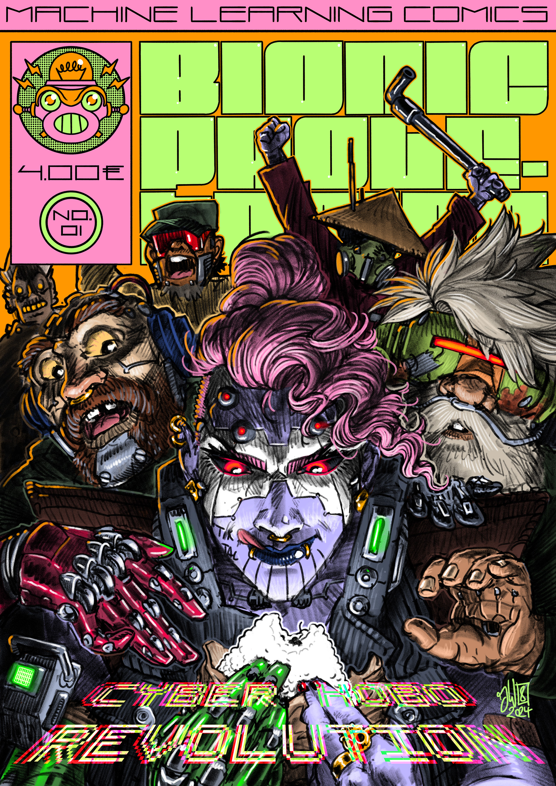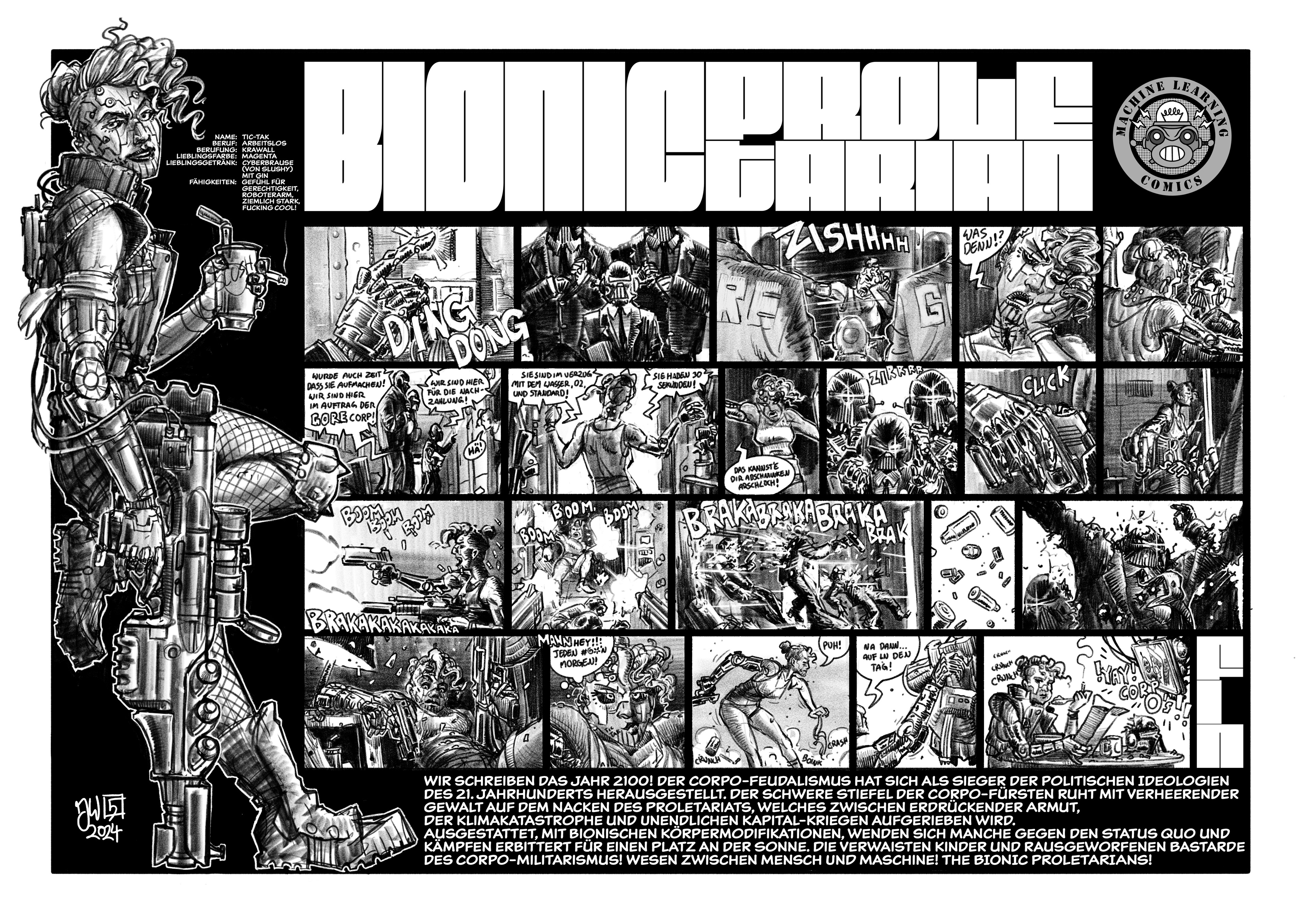 The Comic is a short look into the world of The Bionic Proletarian I am currently working on. The following images contain the comic itself, some variant covers and some concept art. Sorry the comic is only in german language.