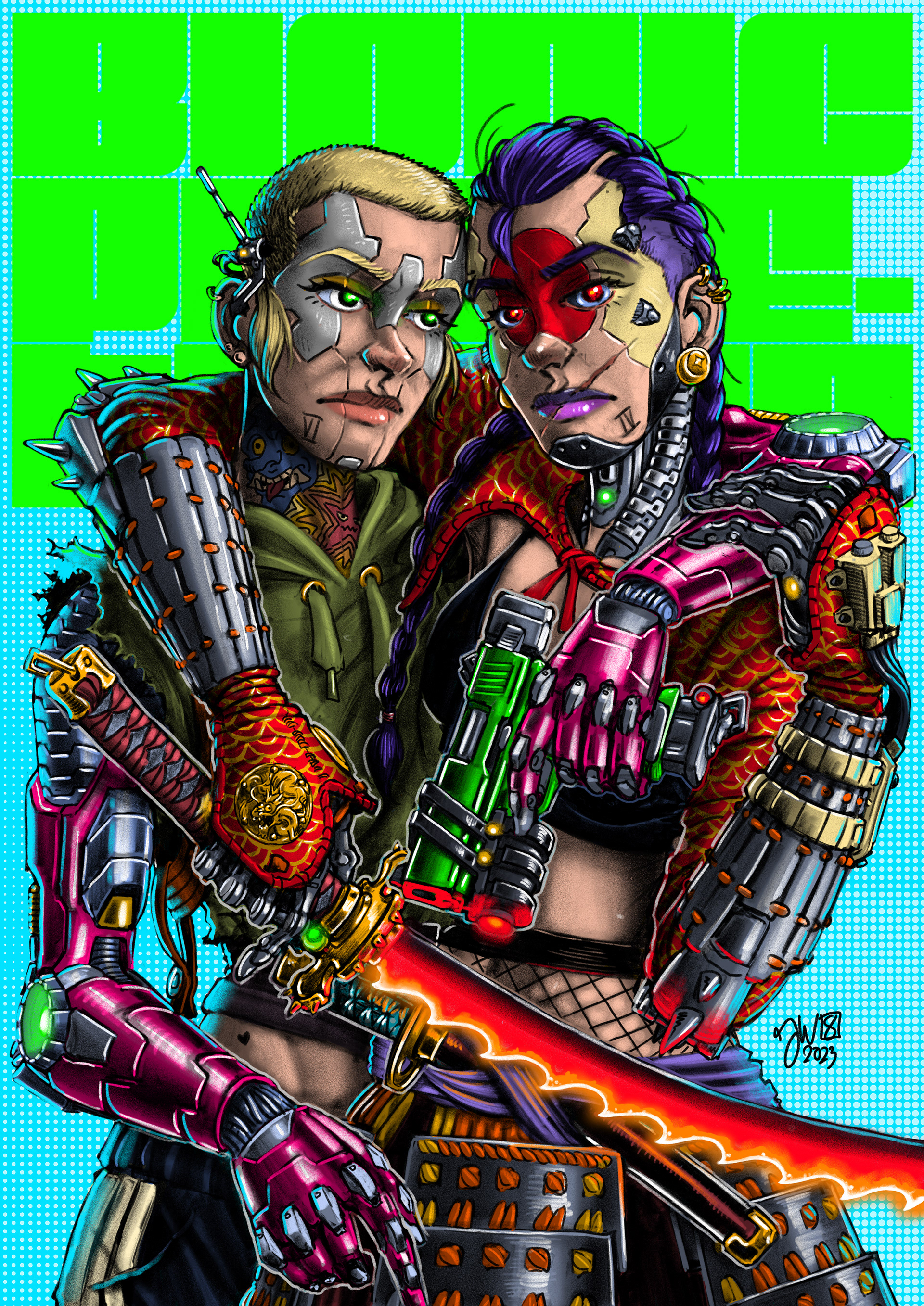 These two are called Cajsa (left) and Lola (right). Cajasa is vat-grown ex-military and mostly synthetic. I wouldn't mess with her and her hyper-shotgun. Losa is a streetwise rockstar and way more chill. Still, I wouldn't mess with her either.
