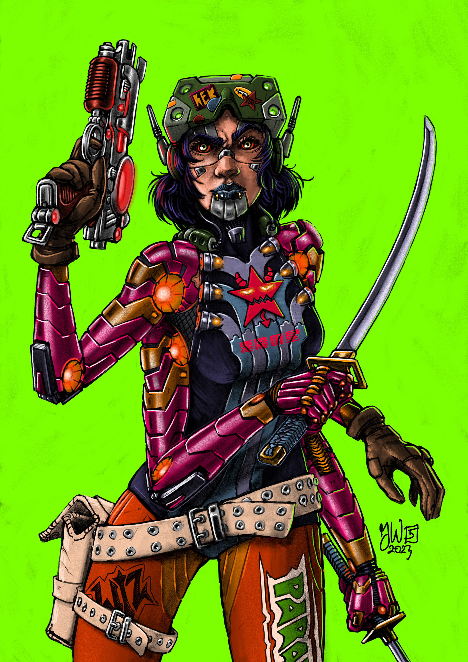 Pax (left) is a gear junky and just generaly a constantly board psychopath. They dont like to show their face and spends all their dough on chrome. The other one (right) just goes by Demonstar. She had got herself an insectoid brain expansion implant a while back and is rockin' two extra arms these days. Only problem is that the implant is doning a number on her humanity. there is no denying that.